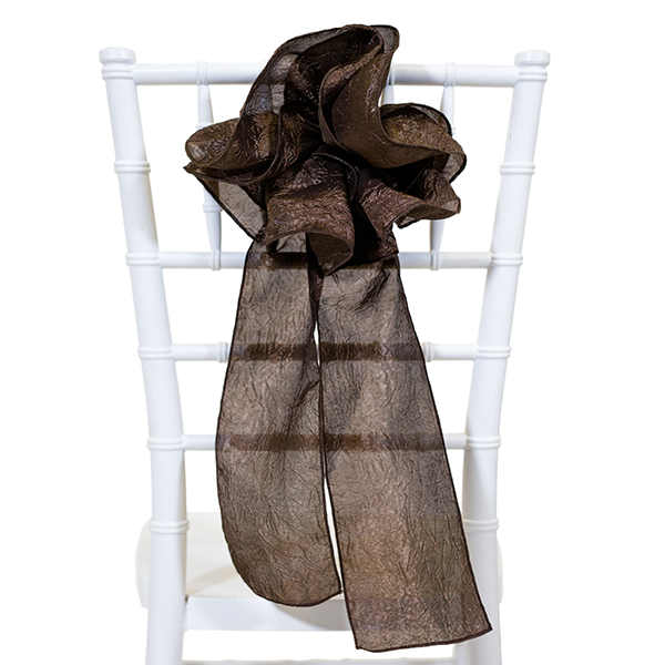 Our 9” chocolate brown crushed taffeta flower chair accents are a great way to add a classic look to your decor. The design of the chocolate brown flower can be customized to your needs, including adding fabric buttons, glistening brooches, or shimmering buckles. The bunched chocolate brown flower drapes exquisitely on the back and fits almost any chair style.