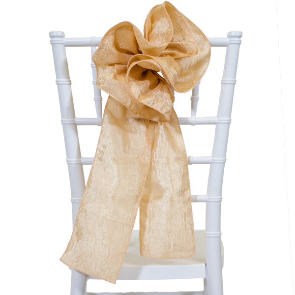 Our 9” light gold crushed taffeta flower chair accents will dazzle your guests from the moment they arrive to the moment they leave. The design of the light gold flower can be customized to your needs, including adding fabric buttons, spectacular brooches, or splendid buckles. The bunched light gold flower drapes beautifully on the back and fits almost any chair style.