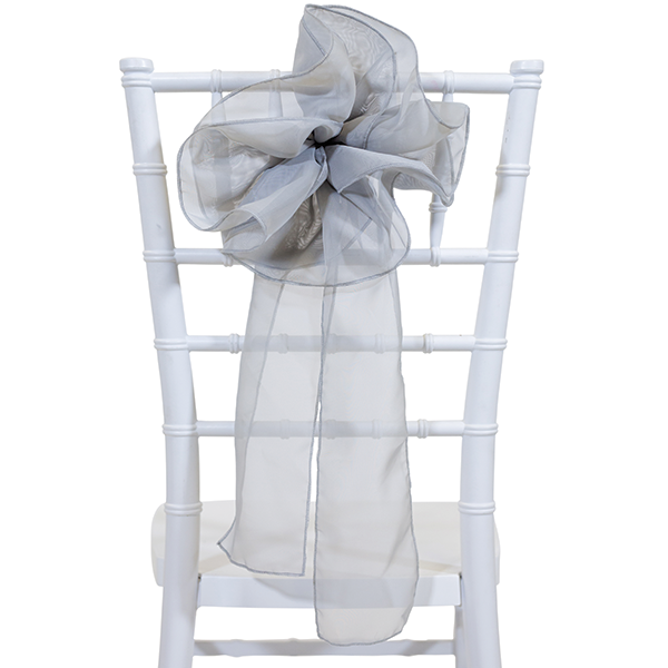 Our 9” silver sheer flower chair accent will make your guests feel like royalty. These silver sheer flowers are high-quality, durable, and look timeless on any chair back. The bunched design is trendy with two flowing sheer ribbons from the base. You can also add a buckle or brooch to this silver flower.