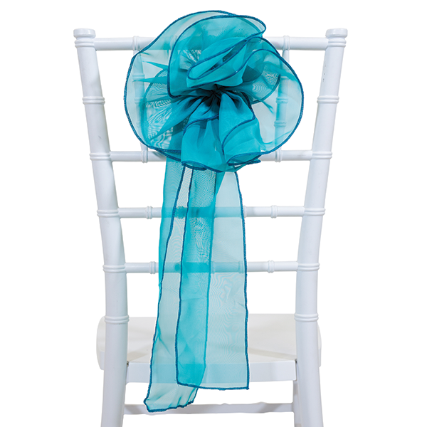 Our 9” teal blue sheer flower chair accent adds a brilliant color to your decor that your guests won’t forget. These teal blue sheer flowers are high-quality, durable, and look amazing on any chair back. The bunched design is intricate with two flowing sheer ribbons from the base. You can also add a buckle or brooch to this teal blue flower.