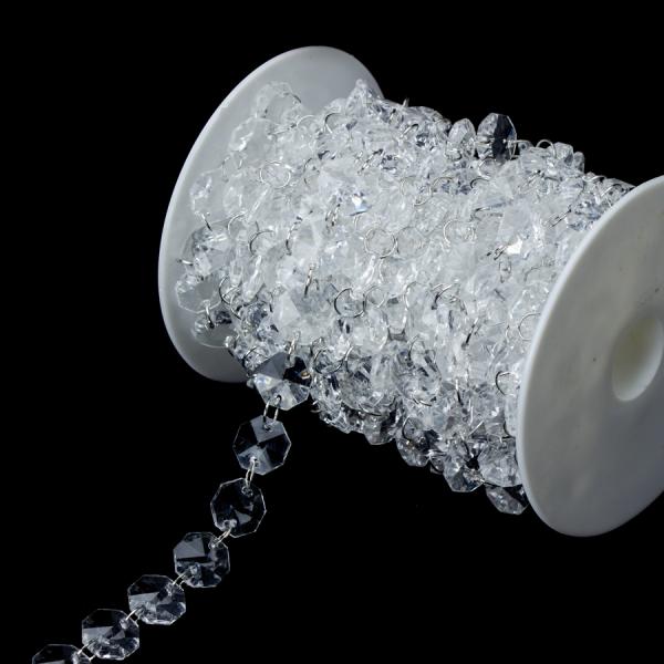 Bedeck your event space in ice with these clear acrylic beads, looped together by simple metal loops. Reminiscent of cut glass and diamonds, these beads match any décor. Perfect for adding to fabric elements or as an alternative to garland, this 10 yard roll can be cut to fit your needs or used as a continuous piece.