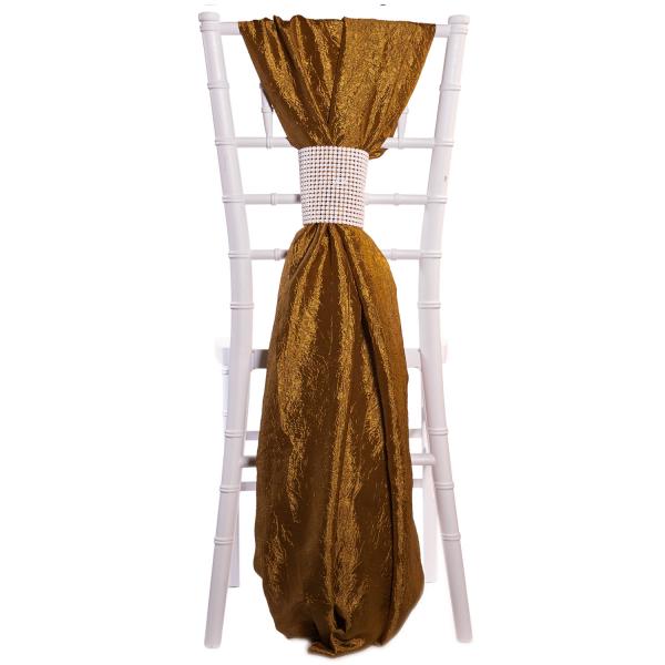 The classic look of crushed taffeta, with its variegated coloring, brings to mind party dresses rustling as ladies dance the night away. Capture that ambiance with these crushed taffeta chair accents. Lightly brushing the floor like the full skirt of a gown, the fabric is then gathered mid way up the chair, like a skirt waist, by a stunning rhinestone band. And just like ball gowns, these accents come in many colors. Use this rich bronze tone to match your color scheme, or mix and match colors to make your dining space resemble a ball room floor.