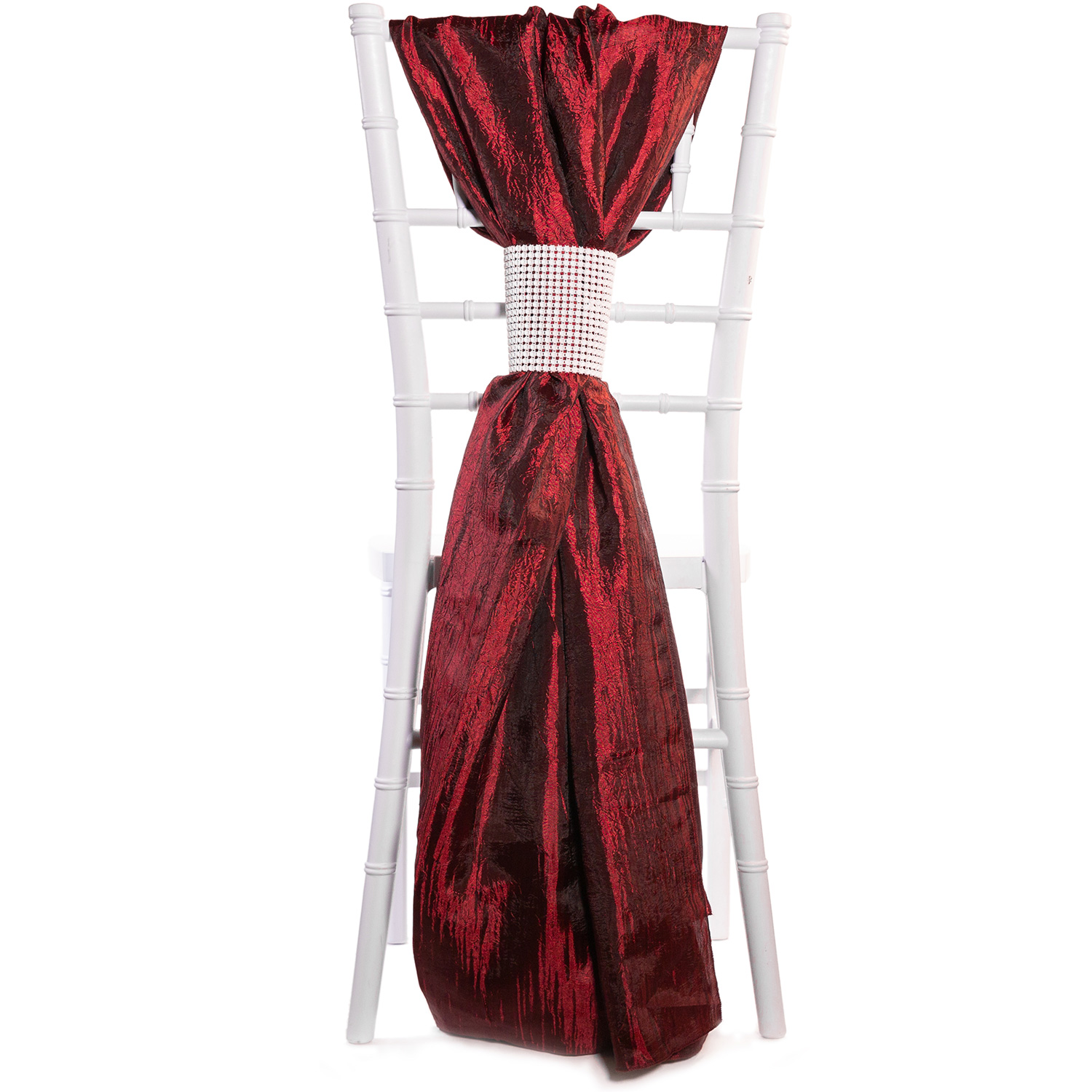 The classic look of crushed taffeta, with its variegated coloring, brings to mind party dresses rustling as ladies dance the night away. Capture that ambiance with these crushed taffeta chair accents. Lightly brushing the floor like the full skirt of a gown, the fabric is then gathered mid way up the chair, like a skirt waist, by a stunning rhinestone band. And just like ball gowns, these accents come in many colors. Use this deep burgundy to match your color scheme, or mix and match colors to make your dining space resemble a ball room floor.
