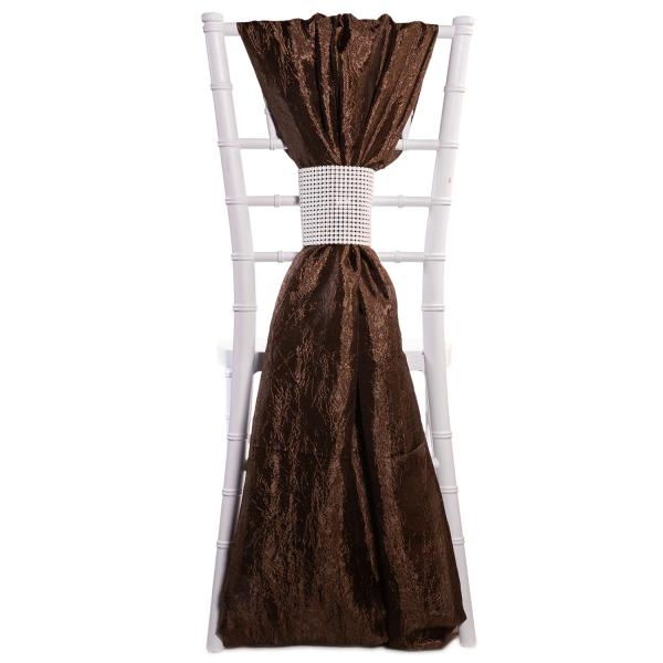 The classic look of crushed taffeta, with its variegated coloring, brings to mind party dresses rustling as ladies dance the night away. Capture that ambiance with these crushed taffeta chair accents. Lightly brushing the floor like the full skirt of a gown, the fabric is then gathered mid way up the chair, like a skirt waist, by a stunning rhinestone band. And just like ball gowns, these accents come in many colors. Use this dark chocolate brown to match your color scheme, or mix and match colors to make your dining space resemble a ball room floor.