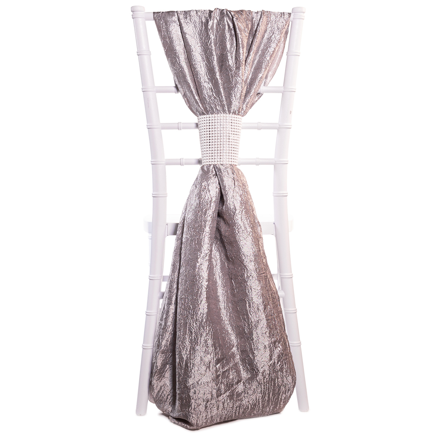 The classic look of crushed taffeta, with its variegated coloring, brings to mind party dresses rustling as ladies dance the night away. Capture that ambiance with these crushed taffeta chair accents. Lightly brushing the floor like the full skirt of a gown, the fabric is then gathered mid way up the chair, like a skirt waist, by a stunning rhinestone band. And just like ball gowns, these accents come in many colors. Use this classic, light silver to match your color scheme, or mix and match colors to make your dining space resemble a ball room floor.