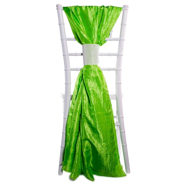 The classic look of crushed taffeta, with its variegated coloring, brings to mind party dresses rustling as ladies dance the night away. Capture that ambiance with these crushed taffeta chair accents. Lightly brushing the floor like the full skirt of a gown, the fabric is then gathered mid way up the chair, like a skirt waist, by a stunning rhinestone band. And just like ball gowns, these accents come in many colors. Use this bright lime green to match your color scheme, or mix and match colors to make your dining space resemble a ball room floor.