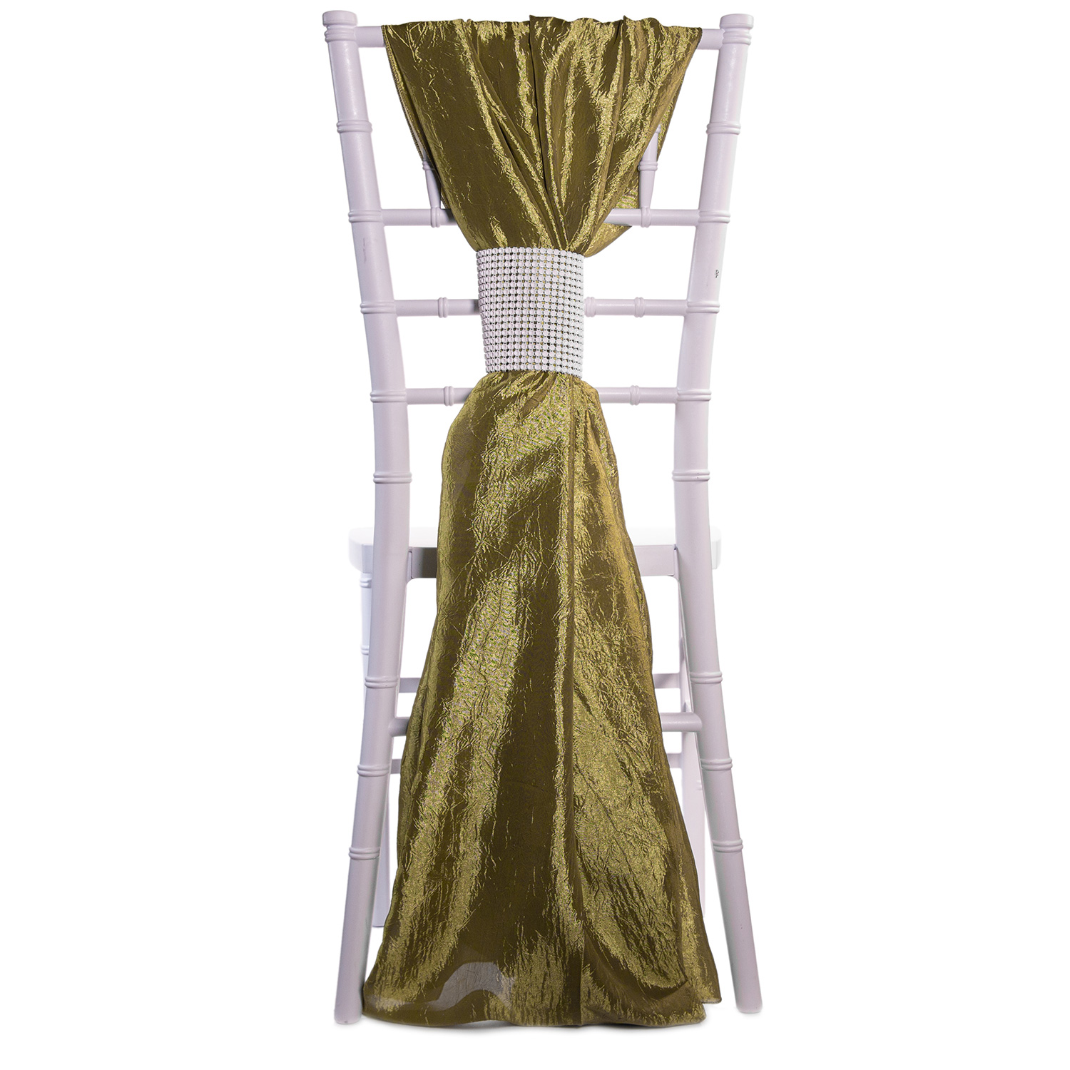 The classic look of crushed taffeta, with its variegated coloring, brings to mind party dresses rustling as ladies dance the night away. Capture that ambiance with these crushed taffeta chair accents. Lightly brushing the floor like the full skirt of a gown, the fabric is then gathered mid way up the chair, like a skirt waist, by a stunning rhinestone band. And just like ball gowns, these accents come in many colors. Use this olive green to match your color scheme, or mix and match colors to make your dining space resemble a ball room floor.