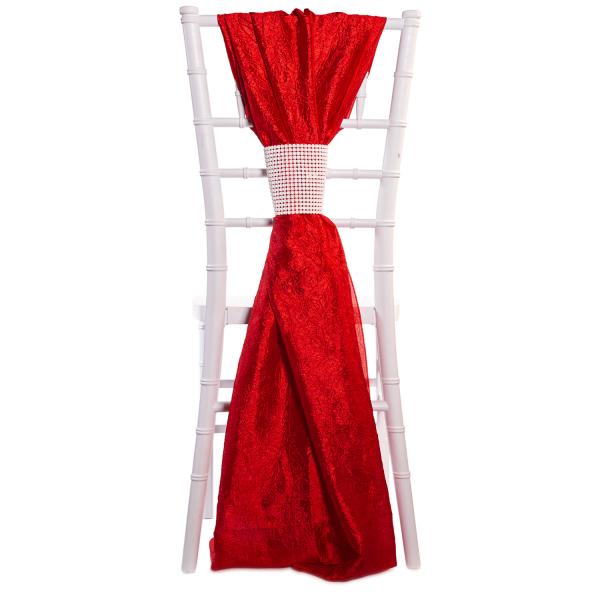 The classic look of crushed taffeta, with its variegated coloring, brings to mind party dresses rustling as ladies dance the night away. Capture that ambiance with these crushed taffeta chair accents. Lightly brushing the floor like the full skirt of a gown, the fabric is then gathered mid way up the chair, like a skirt waist, by a stunning rhinestone band. And just like ball gowns, these accents come in many colors. Use this deep red to match your color scheme, or mix and match colors to make your dining space resemble a ball room floor.