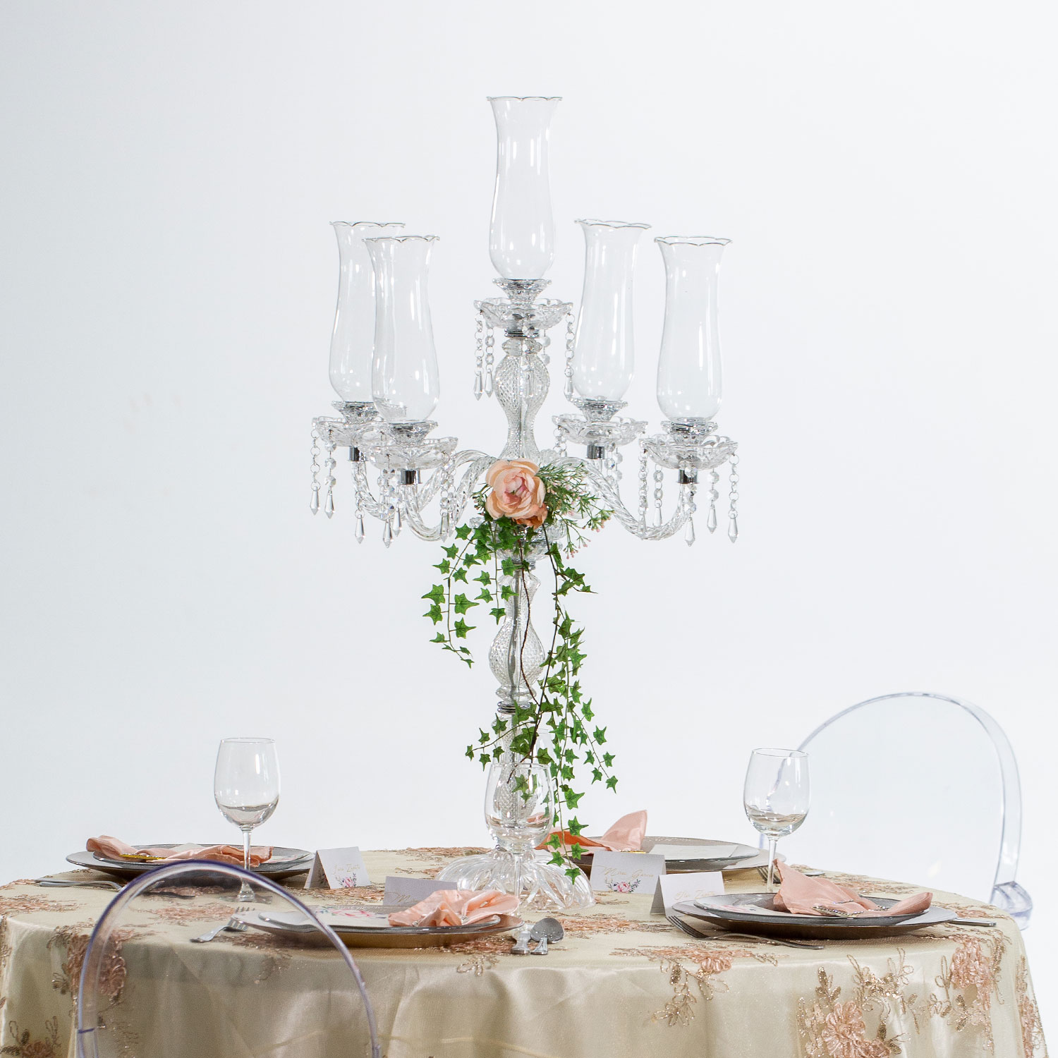 This darling candelabra adds elegance, beauty, and a touch of enchantment to your event décor. Made of clear crystal, the translucent base is formed of a delicate pattern of stacked, curved pieces. Four curving arms gracefully extend from the base, supporting a candle cup topped with a  hurricane globe, each hung with crystal beadwork. At the center is a matching 5th candle arm. This piece will bring beautiful mood lighting to the center of every table. Each arm is hung with crystal beadwork, ending in a small pendent.