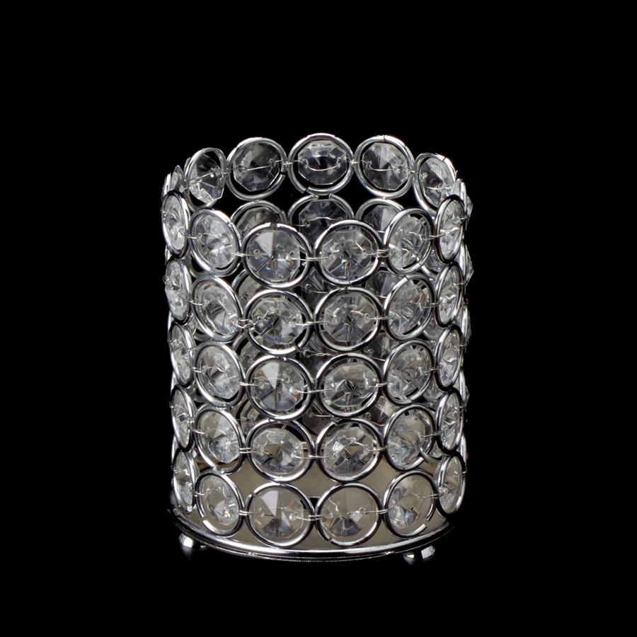 Silver wire, forming a grid made up of connected circles, each one holding a single acrylic crystal, creates the walls of this 4” pillar candle holder. Flickering candle light, or that of an LED candle, make the crystals come to life, casting hints of rainbow colors from the facets of the gems for a beautiful addition to your event tables.
