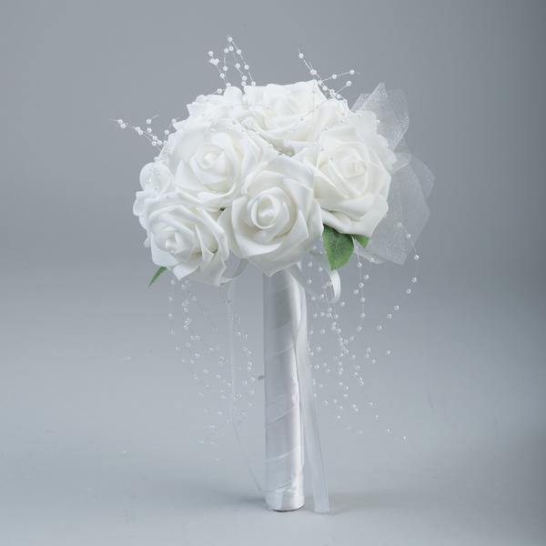 Perfectly formed foam petals make these rose blossoms look almost real. The texture is soft to the touch and to the eye, while the thin material allows for movement. Accented with tiny white seed pearls and tulle, this bouquet of white roses is ready for the center of your table just as it is. Perfect as the base of a throwing bouquet, or as the center of a larger floral arrangement, our foam roses will not disappoint.