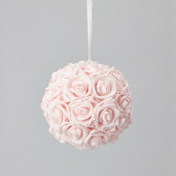 Just as with our silk rose pomanders, this foam, pink rose kissing ball adds an air of whimsy and romance to any event. Though made of foam, these flowers, with their detailed layered petals and the texture of the foam, look real as they dangle throughout your event space. Lightweight with a satin ribbon from which to hang, our 8” kissing balls are a perfect way to add a romantic accent to your next event.
