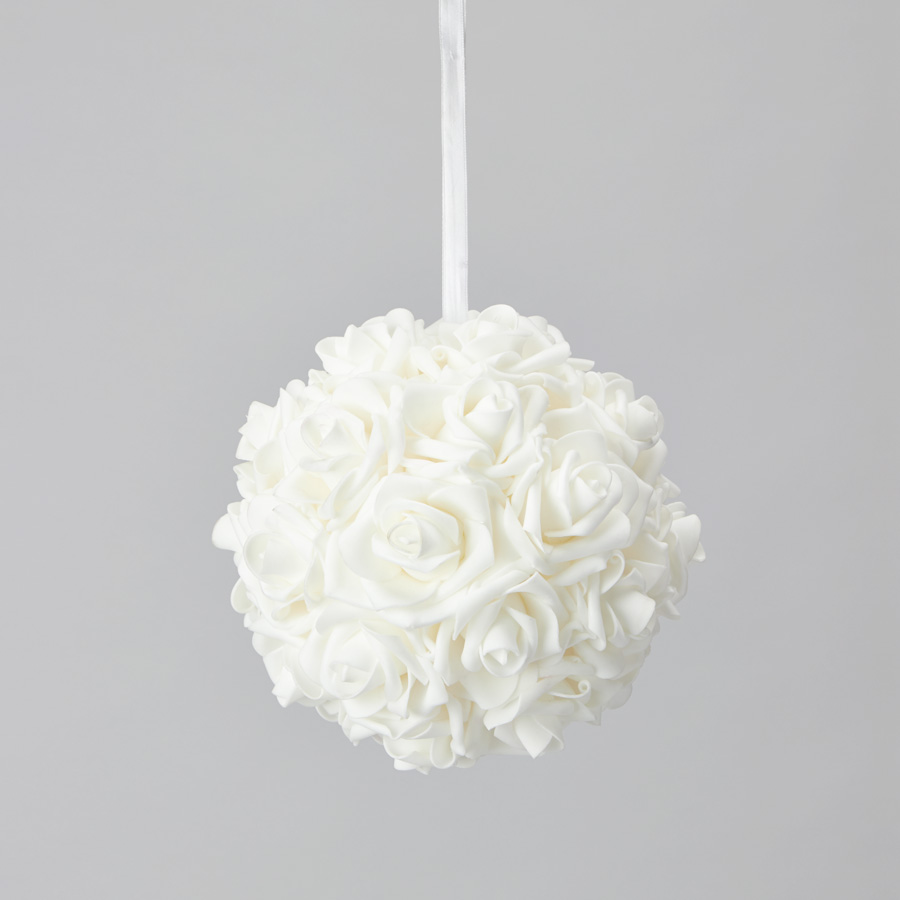 Just as with our silk rose pomanders, this foam, white rose kissing ball adds an air of whimsy and romance to any event. Though made of foam, these flowers, with their detailed layered petals and the texture of the foam, look real as they dangle throughout your event space. Lightweight with a satin ribbon from which to hang, our 8” kissing balls are a perfect way to add a romantic accent to your next event.