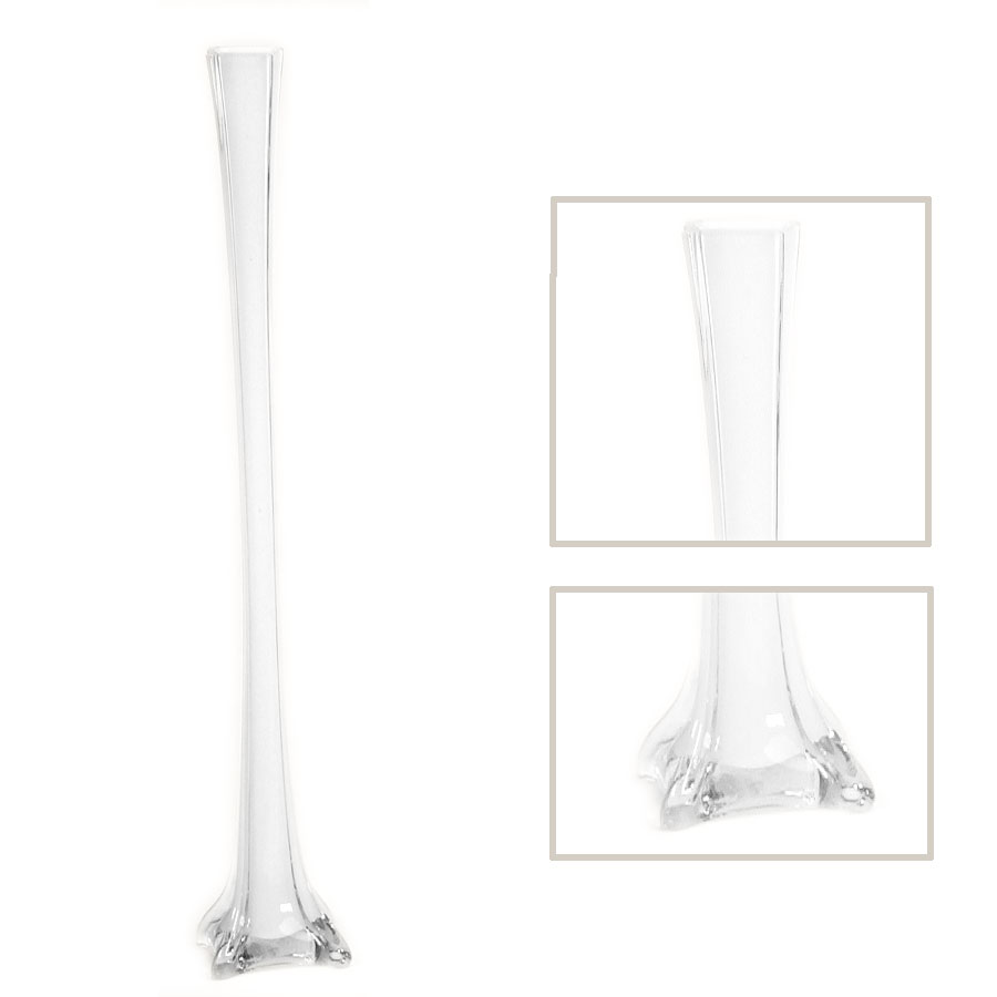 White glass, stretched into a 32” stunning narrow vase provides an elegant vessel for displaying your event flowers. The glass at the base is pulled into four decorative corners with a lined detail that runs up the narrow neck to the top corners of the vase opening. The gentle shift from square to cylinder and back to a square shaped opening is elegant and visually appealing. Our Eiffel tower vases come in different sizes, but all bring a regal look to your décor.
