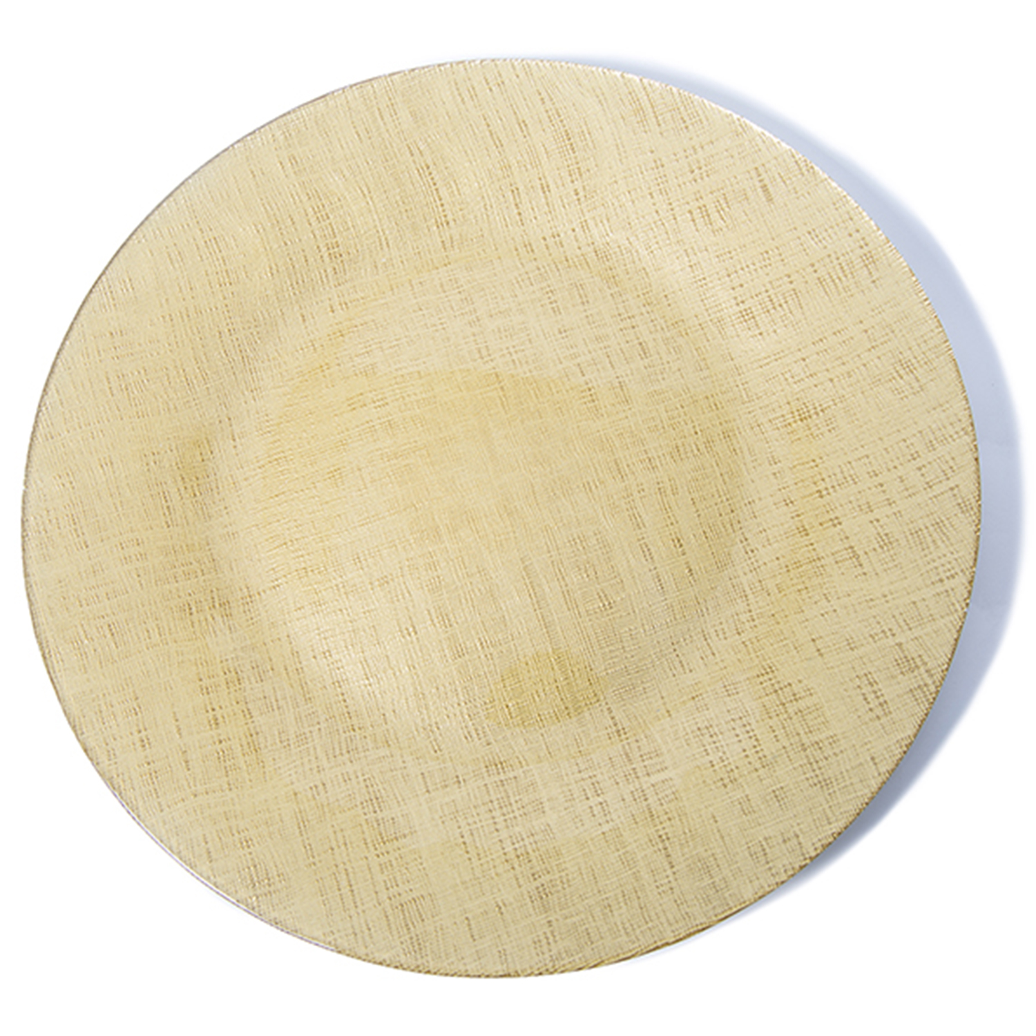 Our gold glass round charger plates allow your guests to dine with fine plates like royalty. This gold glass round charger plate is over 12 inches in diameter and comes in a pack of four. Our gold glass round charger plates catch light under their thick durable glass and create a beautiful shine. Shop these gold charger plates for sale today.