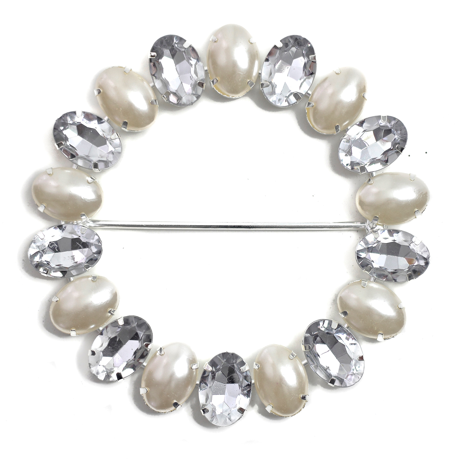 This round buckle with clear and pearl round stones is jumbo size, making it able to hold all your biggest decor needs. The silver backing mixed with clear and pearl round stones add a classic design to your decorations. You can use this buckle with napkins, curtains, chair covers, sashes, and more.