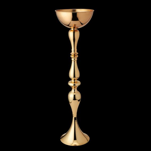 The exquisite and unique shape of this vase is slender, curvy, almost sexy – the curved lines that end in a flared, bell like base are reminiscent of story book mermaids with their fanning tails. Topped with a bowl, these make gorgeous floral arrangements. The simple, classic gold adds to the elegance of your décor, and the 30” height means that these beauties will be sure to catch the eye.