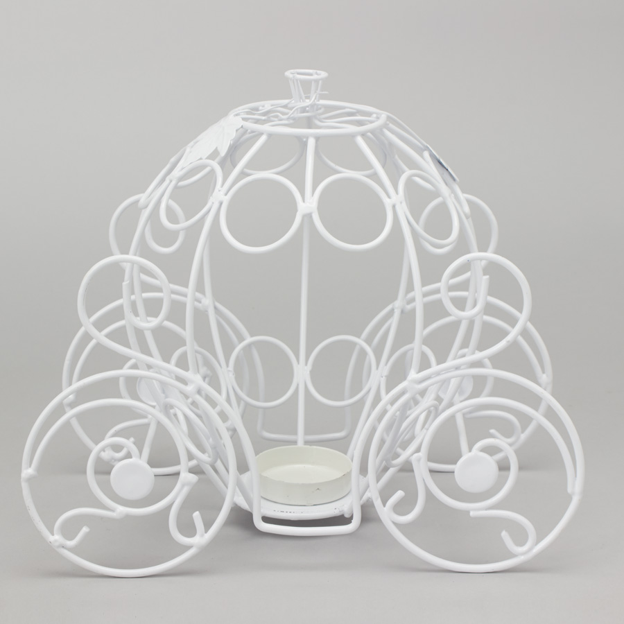 Whisk your guests off to the ball with this Pumpkin Carriage Centerpiece. The open wirework is enchanting, and perfect for attaching flowers and other decorations to. Inside, the carriage holds a dish for a tealight candle. Imagine the flickering canglelight casting shadows through the wire work, a charming effect at your next event.