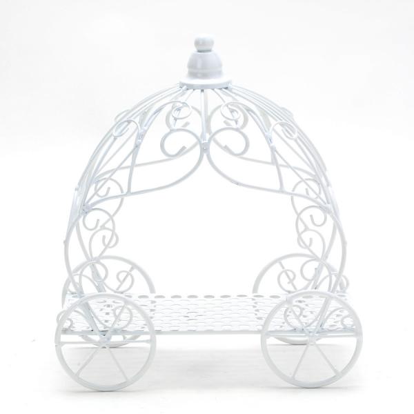Carefully shaped into a waiting pumpkin carriage; this simple metal accent pulls guests into a fantasy world filled with white horses, midnight deadlines, lost slippers, and magical enchantments. The open carriage frame allows you to add flowers, candles, or other accents to add to the whimsical look. The white metal makes this element is perfect for any event.