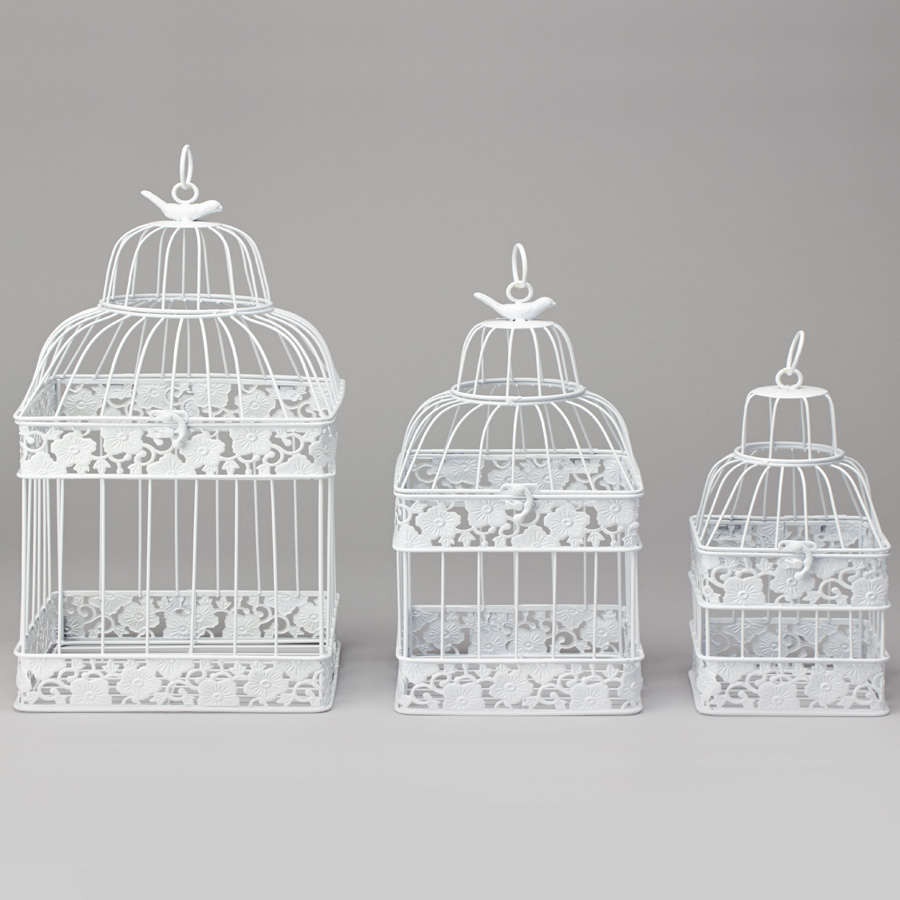 Complete your vintage theme with these white metal bird cages. Accented with a metal worked floral design with a decorative hooked clasp, these cages speak of days gone by. The hexagon shape adds interest to centerpieces and as accents throughout your décor. Each set comes in 3 graduated sizes letting you fit the pieces into varying arrangements
