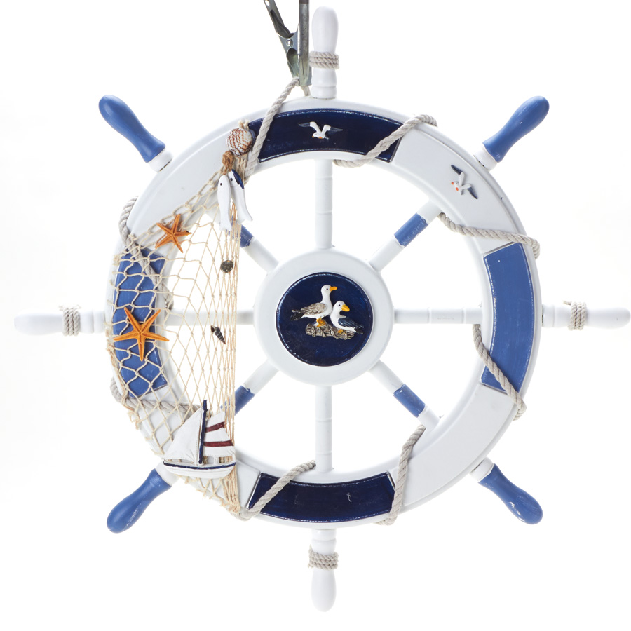 Delight the ocean lover in us all with a wooden captain’s wheel bedecked in blues and whites, netting and rope, gulls and ocean inspired accents. This piece is the perfect addition to add to your nautical themed decor. Or use in your home to bring the ocean in your door.