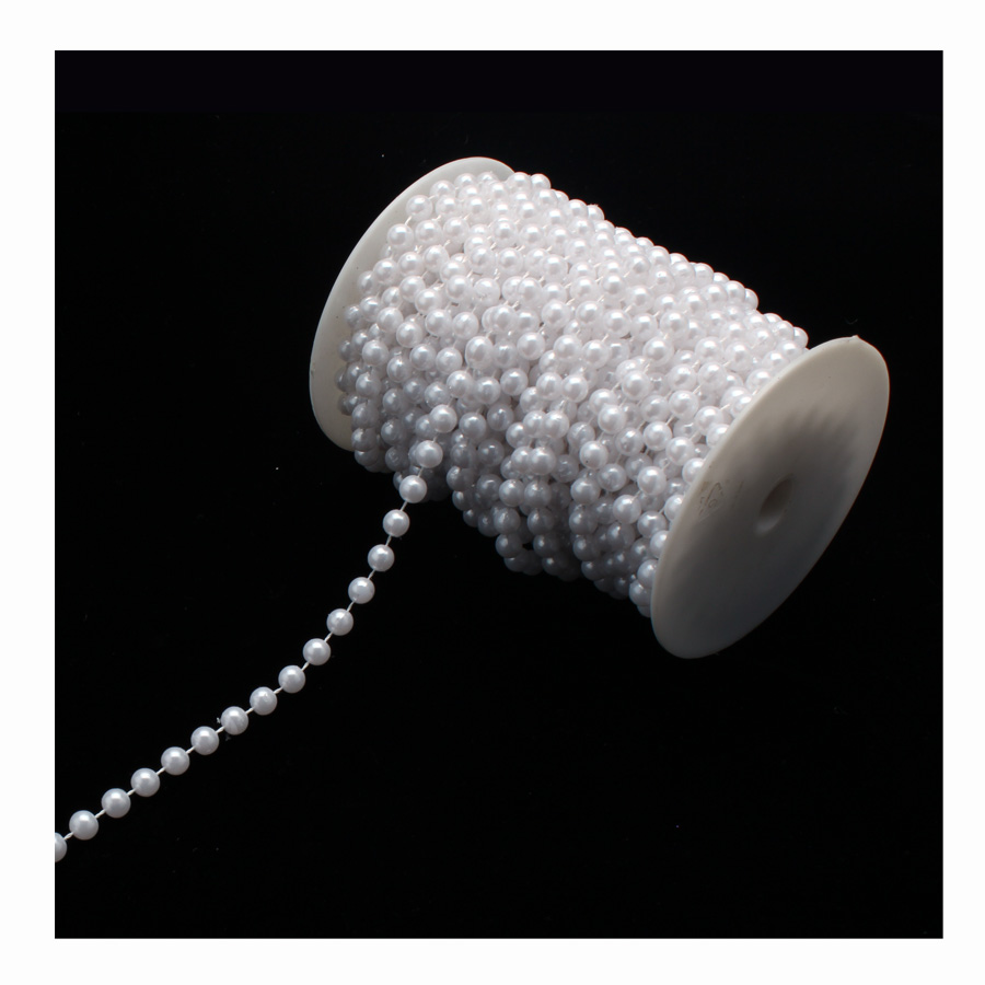 Bring elegant sophistication to your event décor with this string of classic looking white pearls. The simple look of individual, 8 mm pearls strung into a continuous strand brings classic elegance to any décor. This roll contains 66’ of pearl trim and can be cut to fit your needs. Perfect for edging other decorative objects or fabric, great for adding to bouquets and flower arrangements.