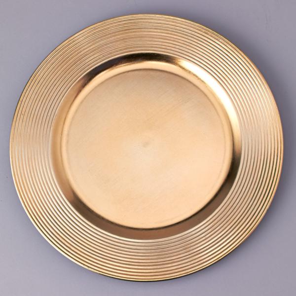 Match your color scheme with the elegant look of gold plated dinnerware without the expensive price tag. Our 13” plastic charger plates are rimmed with a series of ridges circling the edge, bringing the vintage look of an old record to your dinner table.​