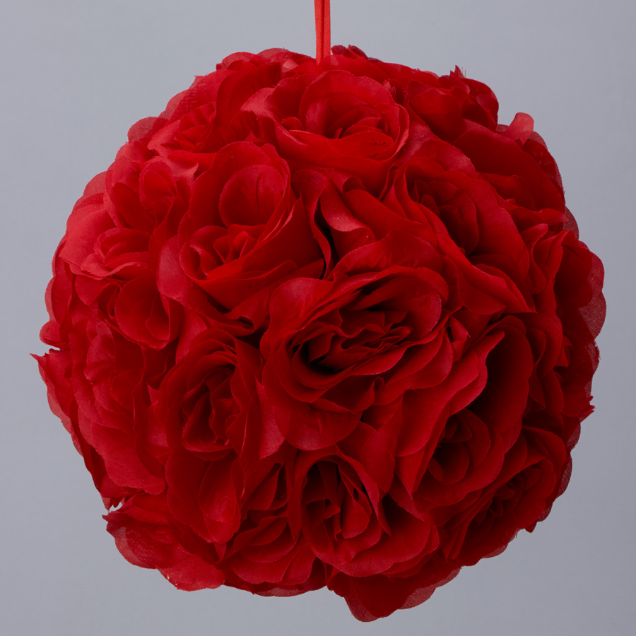 Add some romance to your décor with these 12” red kissing balls. Made from silk roses, these light-weight decorations add color and a little playfulness while still maintaining an elegant air, perfect for any event. These hanging floral arrangements are just the thing for weddings and bridal showers or as a romantic touch to more informal gatherings.