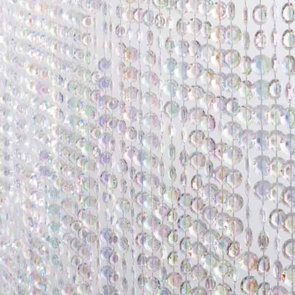 This 12ft iridescent diamond cut crystal curtain makes a beautiful addition to decorations. Whether you add to your backdrops, walls, or doorways, you will give your event decor a shining focal point. This 12ft curtain is topped by a 100% white satin rod pouch that fits over our crossbars. The strands are sewn into the satin to give this curtain durability.