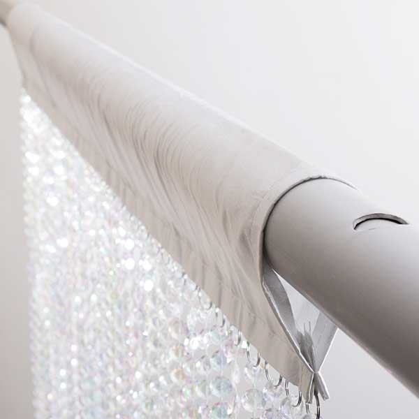 This 9ft iridescent diamond cut crystal curtain makes a beautiful addition to decorations. Whether you add to your backdrops, walls, or doorways, you will give your event decor a shining focal point. This 9ft curtain is topped by a 100% white satin rod pouch that fits over our crossbars. The strands are sewn into the satin to give this curtain durability.