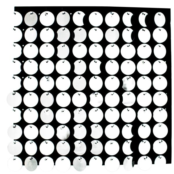 The sequins are attached to a black plastic backing giving them stability and making it possible to use these panels as dividers as well as wall coverings. The backing also creates a wonderful contrast for the silver sequins.