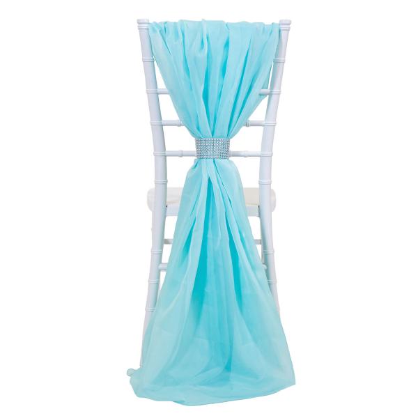 This long, flowing train, in a sheer airy fabric, is just the thing to transform ordinary chairs into the desired seating for your event. Reminiscent of party gowns, this chair accent reaches from the top of the chair back and lightly brushes the floor like the full skirt of a gown, the fabric is then gathered mid way up the chair, like a skirt waist, by a stunning rhinestone band. And just like ball gowns, these accents come in many colors. Use this light angel blue to match your color scheme, or mix and match colors to make your dining space resemble a ball room floor.