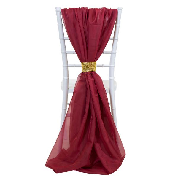 This long, flowing train, in a sheer airy fabric, satin train is just the thing to transform ordinary chairs into the desired seating for your event. Reminiscent of party gowns, this chair accent reaches from the top of the chair back and lightly brushes the floor like the full skirt of a gown, the fabric is then gathered mid way up the chair, like a skirt waist, by a stunning rhinestone band. And just like ball gowns, these accents come in many colors. Use this bright bubblegum pink to match your color scheme, or mix and match colors to make your dining space resemble a ball room floor.