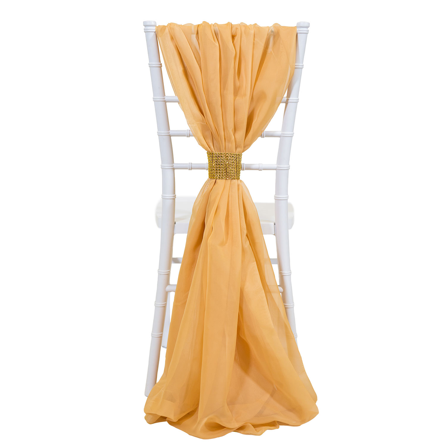 This long, flowing train, in a light gold, sheer fabric, is just the thing to transform ordinary chairs into the desired seating for your event. Reminiscent of party gowns, this chair accent reaches from the top of the chair back and flows to the floor like the full skirt of a gown, the fabric is then gathered mid way up the chair, like a skirt waist, by a stunning rhinestone band. Create a stunning dining space with color coordinated fabrics, or add some whimsy by creating a virtual ballroom with different colored accents gracing each chair.