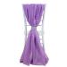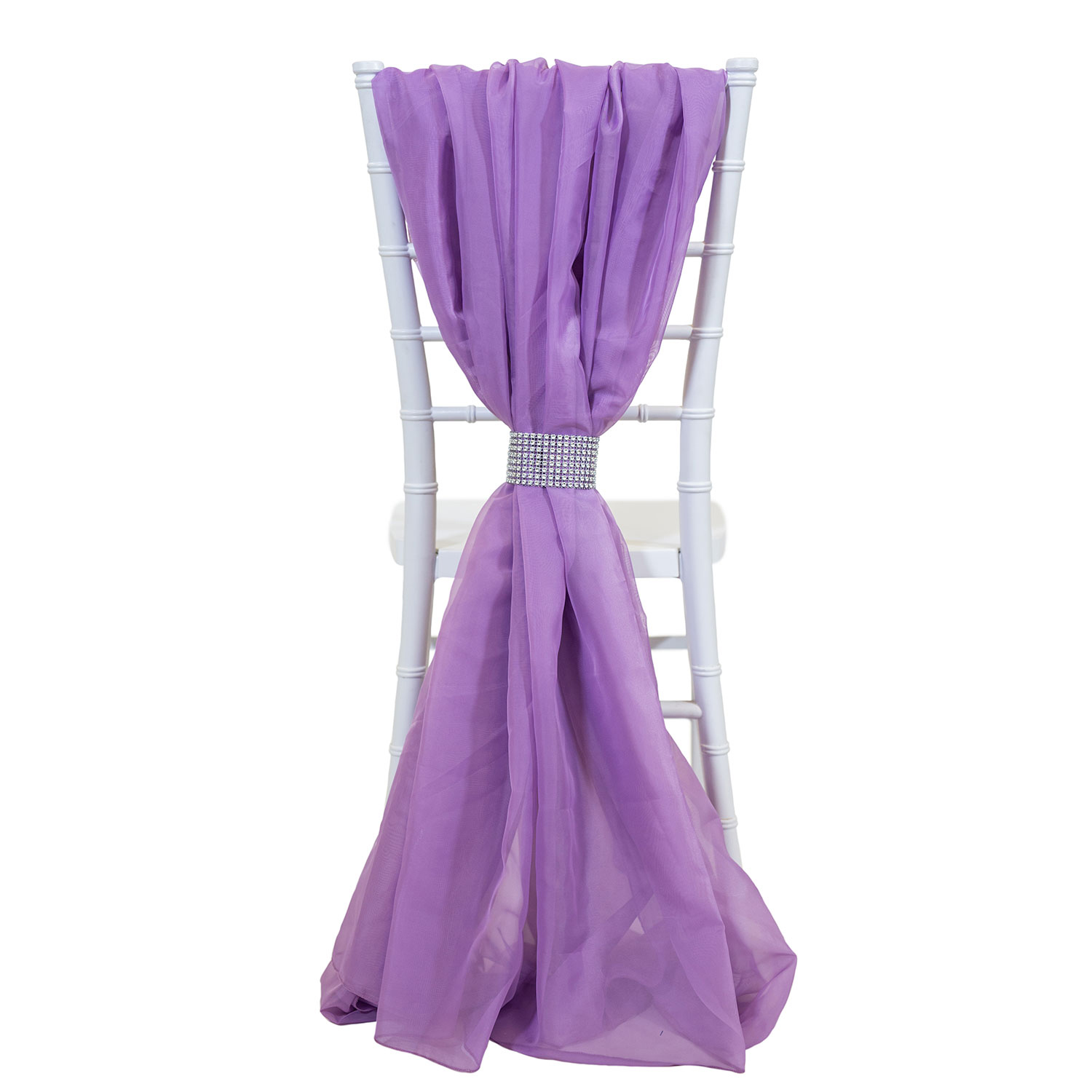 This long, flowing train, in a soft lavender purple, sheer fabric, is just the thing to transform ordinary chairs into the desired seating for your event. Reminiscent of party gowns, this chair accent reaches from the top of the chair back and flows to the floor like the full skirt of a gown, the fabric is then gathered mid way up the chair, like a skirt waist, by a stunning rhinestone band. Create a stunning dining space with color coordinated fabrics, or add some whimsy by creating a virtual ballroom with different colored accents gracing each chair.