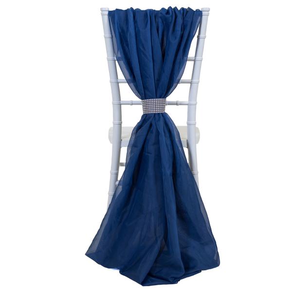 This long, flowing train, in a dark navy blue, sheer fabric, is just the thing to transform ordinary chairs into the desired seating for your event. Reminiscent of party gowns, this chair accent reaches from the top of the chair back and flows to the floor like the full skirt of a gown, the fabric is then gathered mid way up the chair, like a skirt waist, by a stunning rhinestone band. Create a stunning dining space with color coordinated fabrics, or add some whimsy by creating a virtual ballroom with different colored accents gracing each chair.