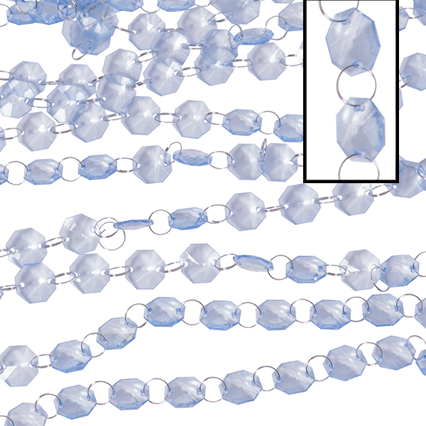 This sky blue acrylic crystal beaded garland is the perfect choice to create an elegant atmosphere at any event. This durable and stylish design uses sky blue acrylic crystals linked together with metal chains. This sky blue beaded garland is a customer favorite and comes in a roll of 30 ft. It can be used in a variety of decorations.