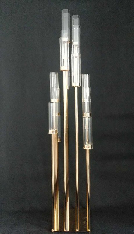 Create a soft and ethereal atmosphere with these elegant candelabras. Equiped with sixteen gold metal arms mounted to glass in staggered formation, they not only emanate a twinkling, romantic glow but are dazzling centerpieces in their own right. They can also be used to line aisles, liven altars, and further embellish floral arrangements. Ideal for weddings, birthdays, communions and more. Best when used with tall taper candles and especially effective when placed near mirrors and windows at night in nooks, anterooms, and halls.