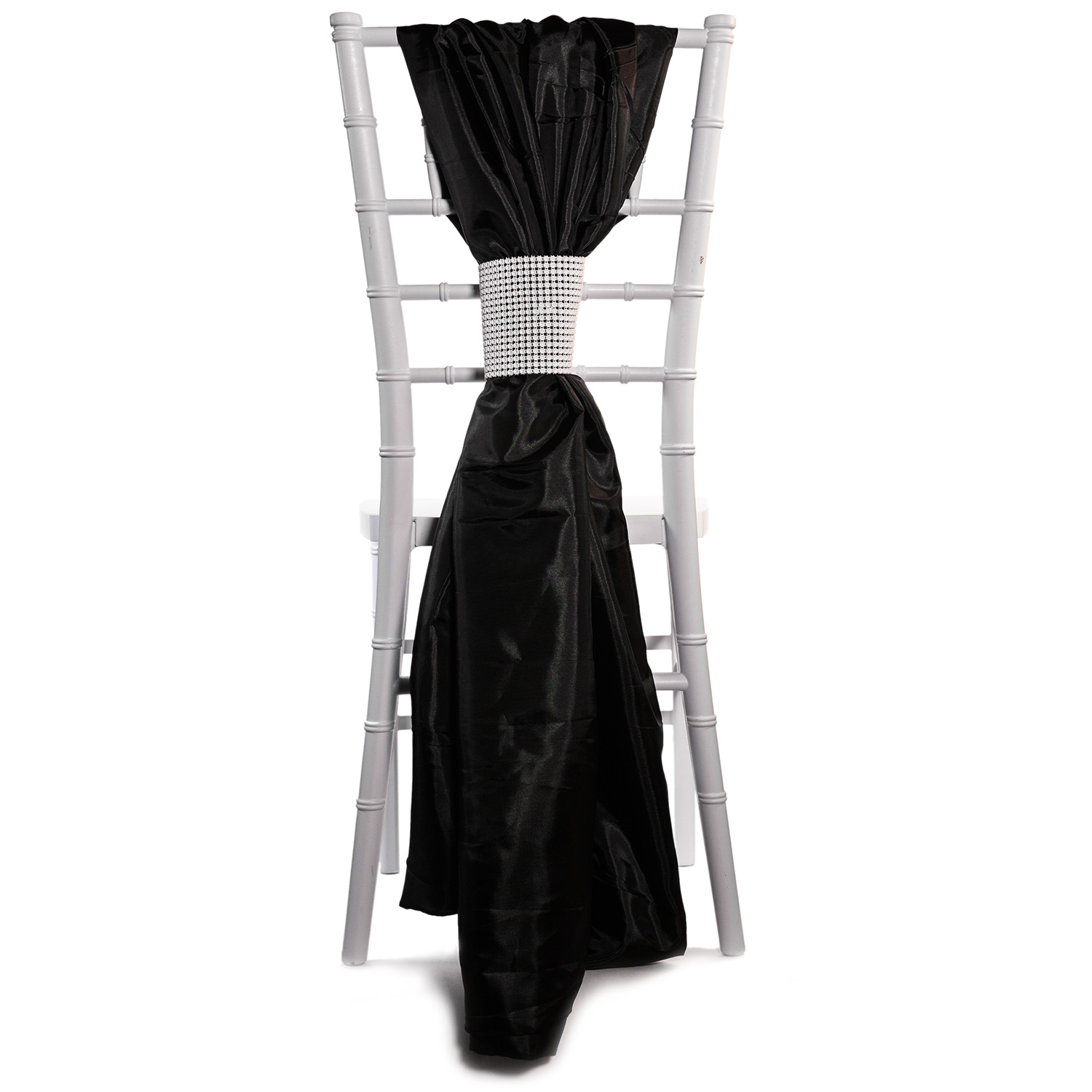 The classic look of taffeta brings to mind party dresses rustling as ladies dance the night away. Capture that sensory memory, adding elegance and timelessness to your event décor with these taffeta chair accents. Flowing from the back of your event chairs, these accents are gathered like a skirt waist with a rhinestone belt at the center before flaring out till they brush the floor.