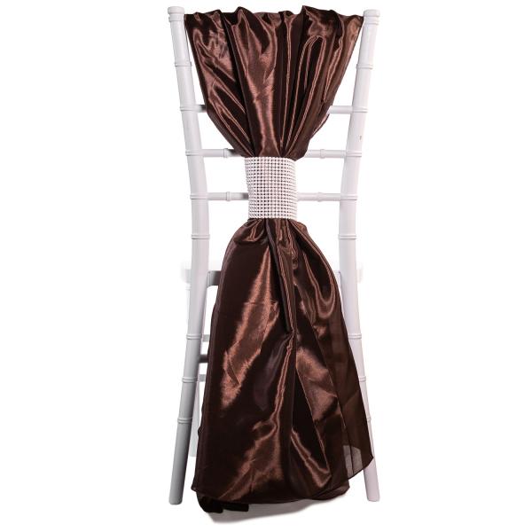 The classic look of taffeta brings to mind party dresses rustling as ladies dance the night away. Capture that sensory memory, adding elegance and timelessness to your event décor with these taffeta chair accents. Flowing from the back of your event chairs, these accents are gathered like a skirt waist with a rhinestone belt at the center before flaring out till they brush the floor.