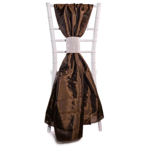 The classic look of taffeta brings to mind party dresses rustling as ladies dance the night away. Capture that sensory memory, adding elegance and timelessness to your event décor with these taffeta chair accents. Flowing from the back of your event chairs, these accents are gathered like a skirt waist with a rhinestone belt at the center before flaring out till they brush the floor.