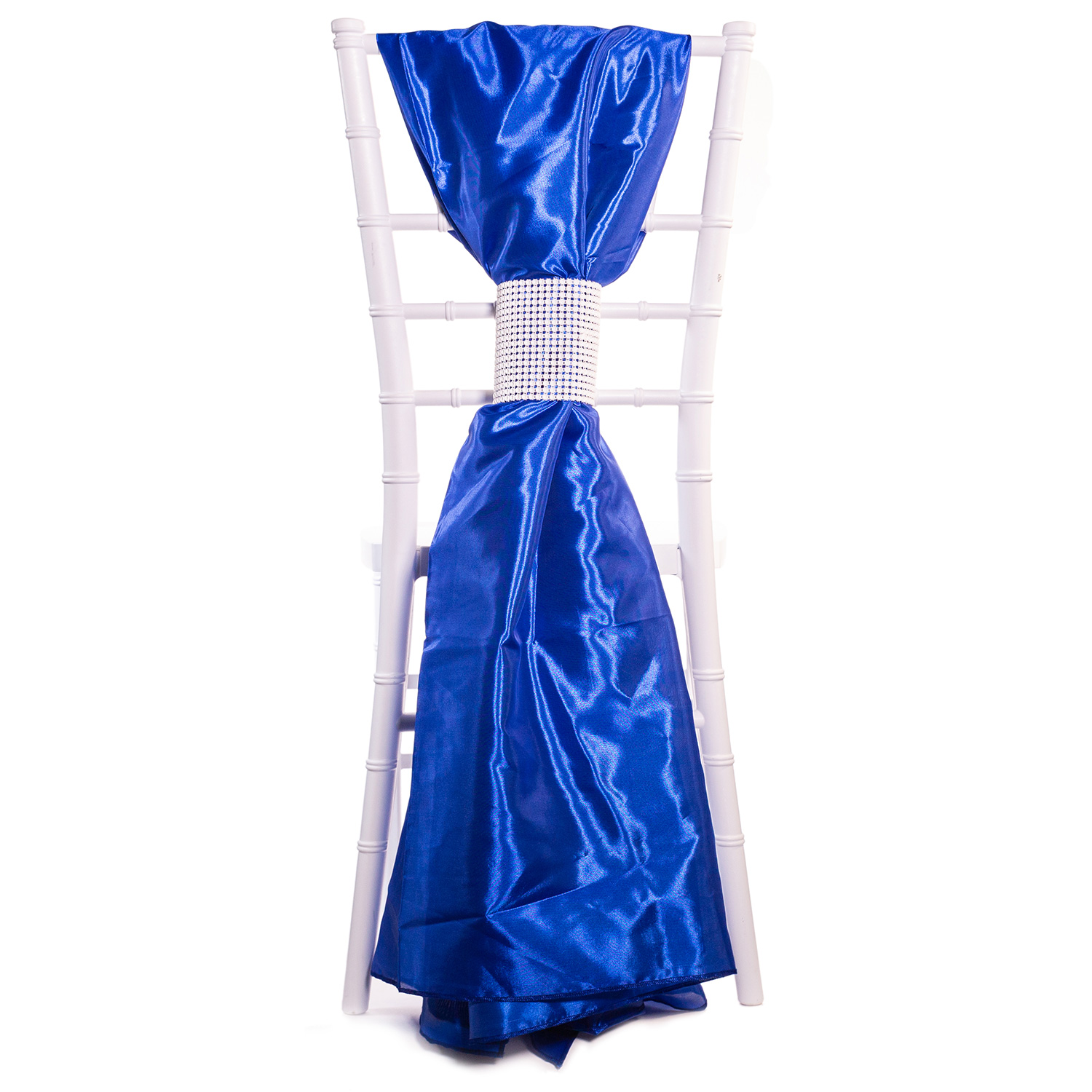 The classic look of taffeta brings to mind party dresses rustling as ladies dance the night away. Capture that sensory memory, adding elegance and timelessness to your event décor with these taffeta chair accents. Flowing from the back of your event chairs, these accents are gathered like a skirt waist with a rhinestone belt at the center before flaring out till they brush the floor.