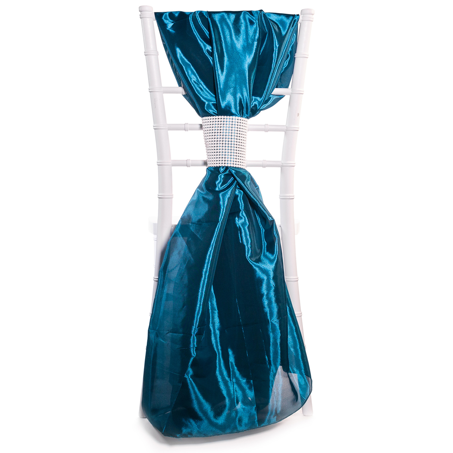 The classic look of taffeta brings to mind party dresses rustling as ladies dance the night away. Capture that sensory memory, adding elegance and timelessness to your event décor with these taffeta chair accents. Flowing from the back of your event chairs, these accents are gathered like a skirt waist with a rhinestone belt at the center before flaring out till they brush the floor.