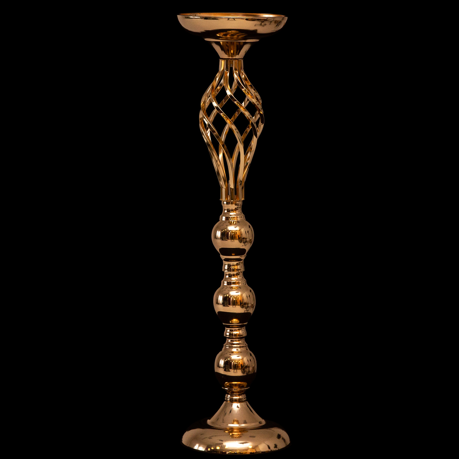 This aluminum candle holder is breathtaking. Three curving metal balls, stacked together and separated with decorative elements, give this piece a sold looking base. Add to that the bright gold color and you would never know this piece is aluminum. This solid look is topped with an airy, cage made of twisted metal, almost like an elegant egg, that ends in a golden bowl waiting for an elegant candle to top it off.