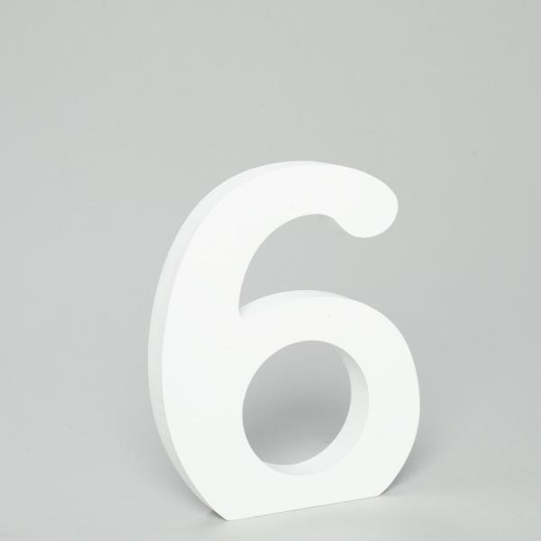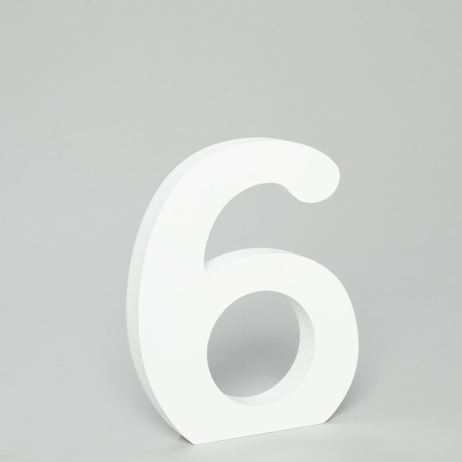Create number or letter decoration for your events with this free standing, white, wooden 6. Each of our wooden pieces has a flat bottom, making them stand alone, or they can be added to one of our letter bases. The white color makes it easy to match your color theme. Numbers stand 5” tall. Other letters and numbers available, sold separately.