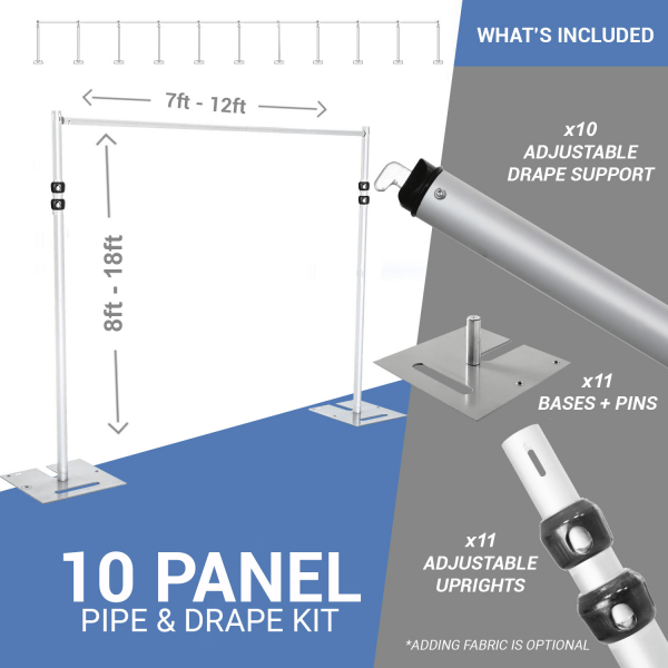 Contains: 11 x Uprights 11 x Bases 10 x 7-12ft Drape Support