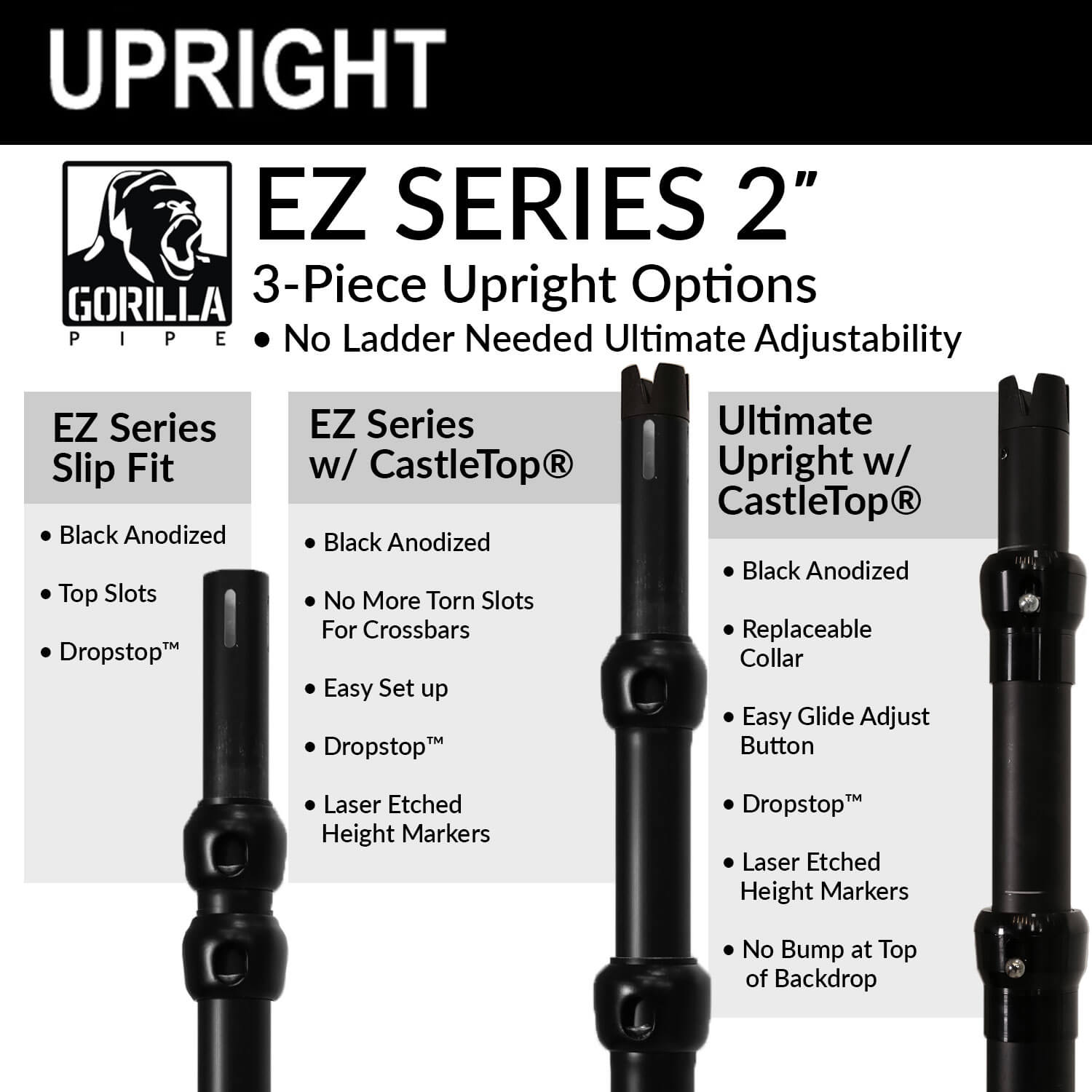 NOTES: Due to variation between manufacturing runs the locking collar on uprights may differ in color (silver or black). This does not affect the quality or functionality of the pipe.