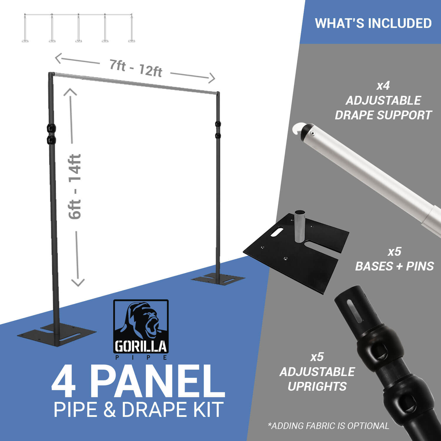 DELUXE-4 Panel Black Anodized Pipe and Drape Kit / Backdrop - 6-14 Feet Tall (Adjustable) Comes W/ 3 Piece Uprights for Maximum Height Adjustment[BLK-GE-KIT-PRO-4PANEL-614]
