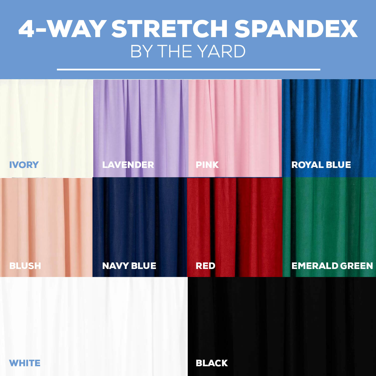 Banjo Cloth Drapes are 48" Wide, Velour are 52" Wide, Poly Premier are 60" Wide and Sheer are 10ft Wide (!) and each backdrop panel is equipped with 3 or 4 drapes (if drape option is chosen, # depends on type of drape)