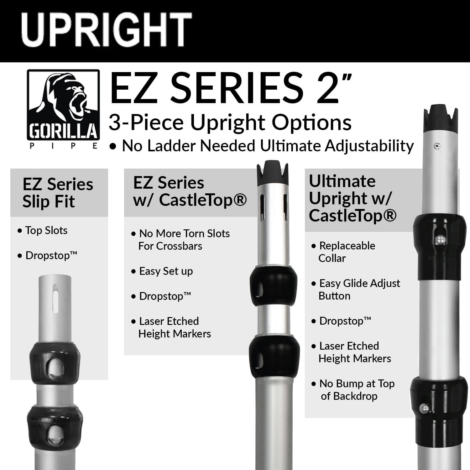 NOTES: 1. Please allow 48 hours for production of all fabric products. 2. Due to variation between manufacturing runs the locking collar on uprights may differ in color (silver or black). This does not affect the quality or functionality of the pipe.